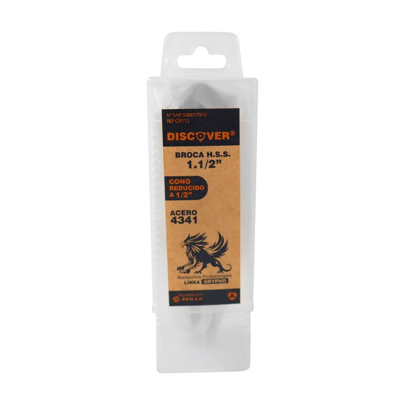 Broca H.S.S. Discover 1 1/2" con cono reducido a 1/2" está diseñada para perforaciones de gran diámetro en aplicaciones industriales exigentes.