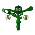 Aspersor para riego; Conexión macho de 1/2"; alcance aproximado 13 a 15 metros; Presión continua; Caudal 23-28 l/min; 2 Válvulas en bronce; Cuerpo en PVC;