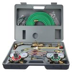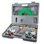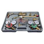 Incluye reguladores, boquillas y accesorios fabricados en cobre y bronce, materiales resistentes a altas temperaturas y presión. El estuche plástico facilita el transporte y protege los componentes. Ideal para talleres, mantenimiento industrial y trabajos de campo.