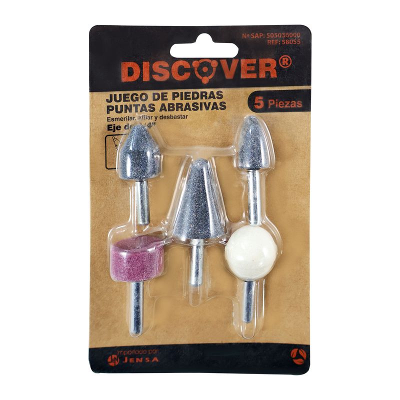 Juego de 5 piedras punta abrasivas 1/4" Discover está desarrollado para trabajos de mayor exigencia en desbaste y esmerilado con moto tool.