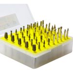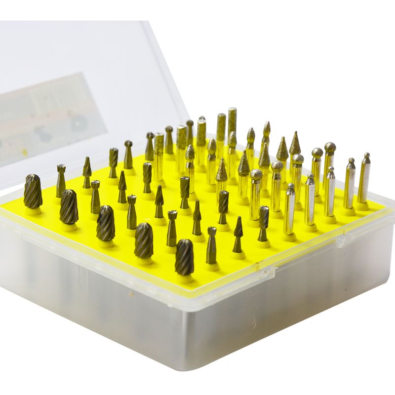 Juego de 50 fresas de alta velocidad Discover 1/8" es un set profesional diseñado para trabajos de desbaste, tallado, grabado y conformado en diferentes materiales utilizando moto tool.