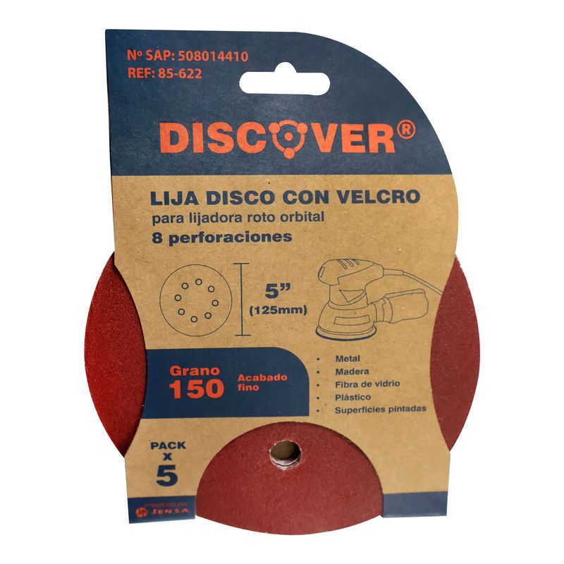Lija disco con velcro 5" (127mm) 8 huecos, P 150 x 5 unidades DISCOVER